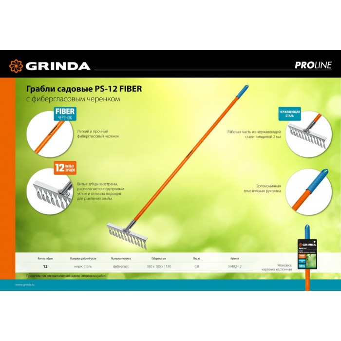 Садовые грабли PS-12 FIBER, 380 х 100 х 1530 мм, 12 витых зубцов, нержавеющая сталь, фибергласовый черенок, PROLine GRINDA 39482-12