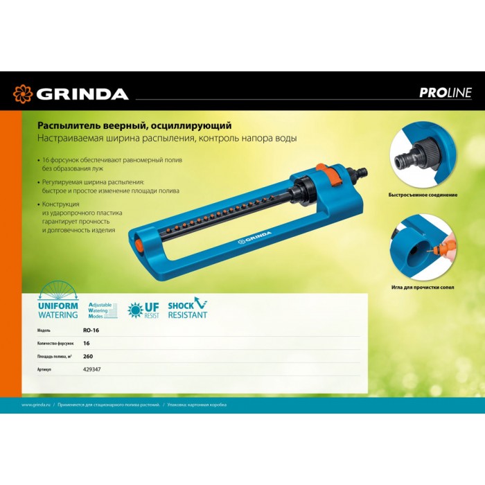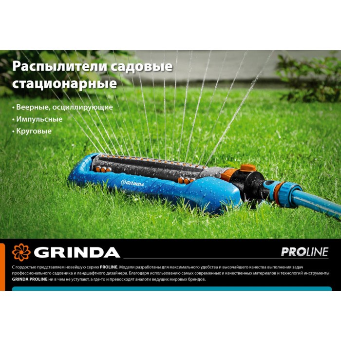 Профессиональные стационарные распылители GRINDA PROLine отличаются особой прочностью, надёжностью, удобством и долговечностью. Обеспечивают простое, быстрое и герметичное подключение к поливочной системе. Широкий ассортимент позволит подобрать модель идеально подходящую именно для ваших задач.