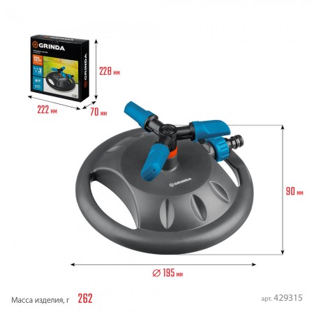 - 3 поворотных сопла позволяют настроить радиус полива и обеспечивают его равномерность. Конструкция из ударопрочного пластика гарантирует прочность и долговечность изделия. Специальная подставка обеспечивает устойчивость установленного распылителя.