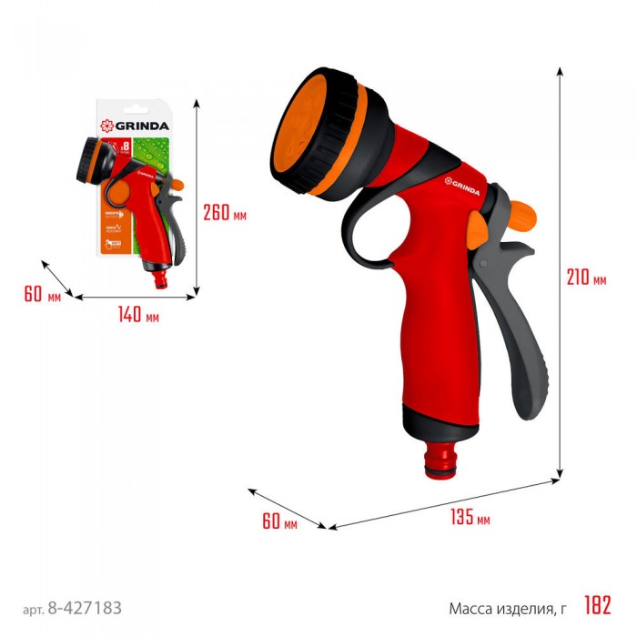 Поливочные пистолеты-распылители GRINDA удобны, надёжны и долговечны. Обеспечивают простое и качественное подключение к поливочной системе. Широкий модельный ряд с самыми современными и эффективными режимами полива.
