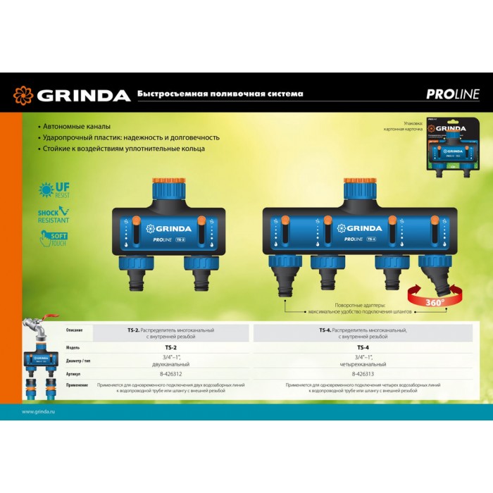 Профессиональные аксессуары серии GRINDA PRO-LINE для поливочных систем отличаются прочностью, надёжностью и долговечностью. Обеспечивают быстрое, простое и герметичное соединение элементов. Широкий ассортимент поможет подобрать нужную модель для любого популярного типа и размера поливочной системы.