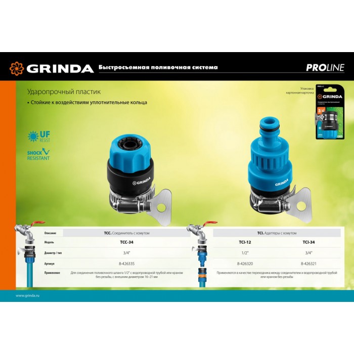 Профессиональные аксессуары серии GRINDA PRO-LINE для поливочных систем отличаются прочностью, надёжностью и долговечностью. Обеспечивают быстрое, простое и герметичное соединение элементов. Широкий ассортимент поможет подобрать нужную модель для любого популярного типа и размера поливочной системы.
