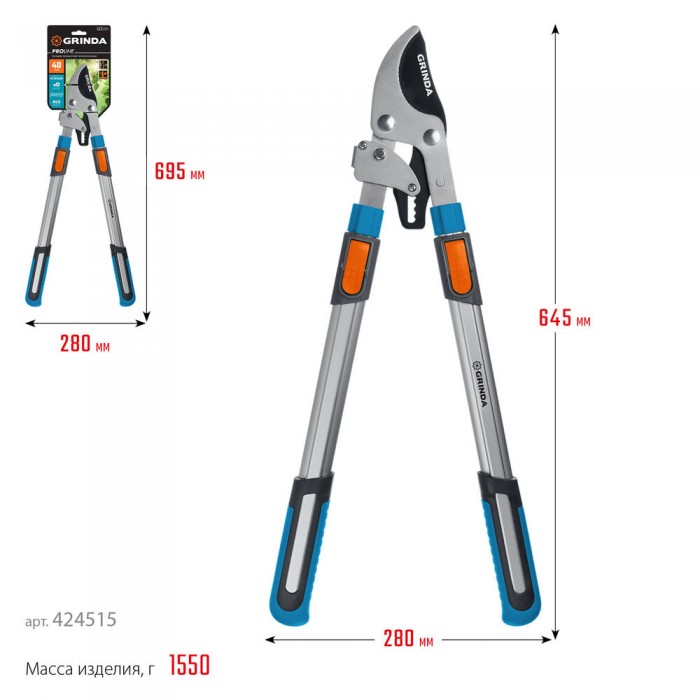 Плоскостной сучкорез TX-980, 645 - 885 мм, высокоуглеродистая сталь, закаленные лезвия, храповый механизм, телескопический, PROLine GRINDA 424515
