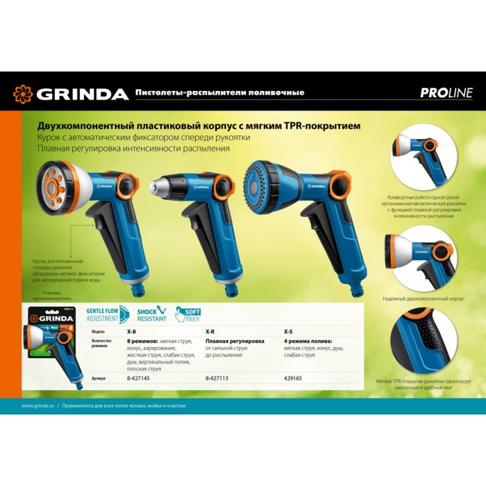 Профессиональные поливочные пистолеты-распылители GRINDA PROLine отличаются особой прочностью, надёжностью, удобством и долговечностью. Обеспечивают простое, быстрое и герметичное подключение к поливочной системе. Широкий ассортимент позволит подобрать модель идеально подходящую именно для ваших задач.