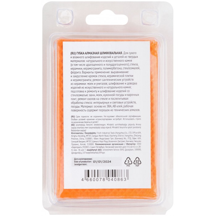 Для сухого и влажного шлифования изделий и деталей из твердых материалов: натурального и искусственного камня (в том числе драгоценного и полудрагоценного), стекла, керамики, керамогранита, полимербетона, стеклоэмалей, феррита. Материал: основа из ЭВА, АВ клей, рабочая поверхность содержит порошок из технических алмазов. Упаковка: блистер.