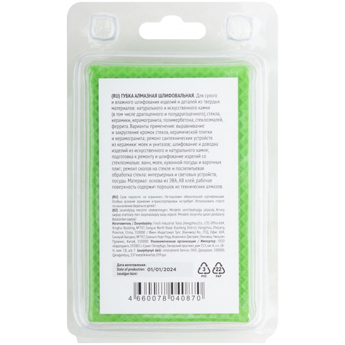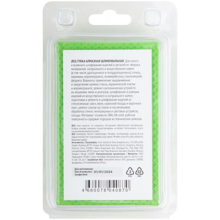 Для сухого и влажного шлифования изделий и деталей из твердых материалов: натурального и искусственного камня (в том числе драгоценного и полудрагоценного), стекла, керамики, керамогранита, полимербетона, стеклоэмалей, феррита. Материал: основа из ЭВА, АВ клей, рабочая поверхность содержит порошок из технических алмазов. Упаковка: блистер.