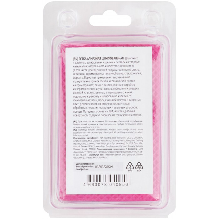 Для сухого и влажного шлифования изделий и деталей из твердых материалов: натурального и искусственного камня (в том числе драгоценного и полудрагоценного), стекла, керамики, керамогранита, полимербетона, стеклоэмалей, феррита. Материал: основа из ЭВА, АВ клей, рабочая поверхность содержит порошок из технических алмазов. Упаковка: блистер.