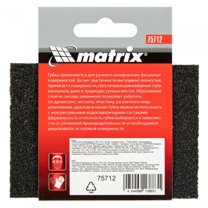 Губка для шлифования, 100 х 70 х 25 мм, средняя плотность, P 60 Matrix (75712)