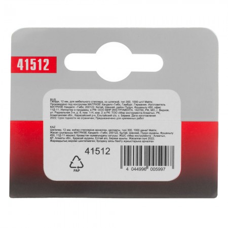 Гвозди, 12 мм, для мебельного степлера, со шляпкой, тип 300, 1000 шт Matrix (41512)