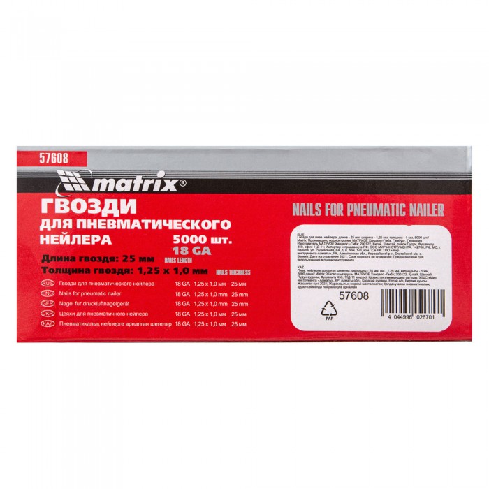 Гвозди для пневматического нейлера, длина 25 мм, ширина 1.25 мм, толщина 1 мм, 5000 шт Matrix (57608)