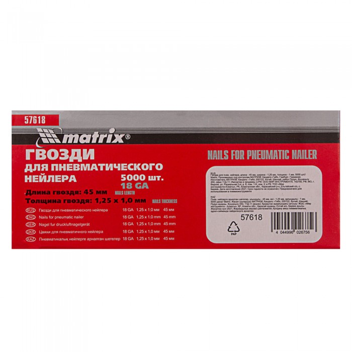 Гвозди для пневматического нейлера, длина 45 мм, ширина 1.25 мм, толщина 1 мм, 5000 шт Matrix (57618)