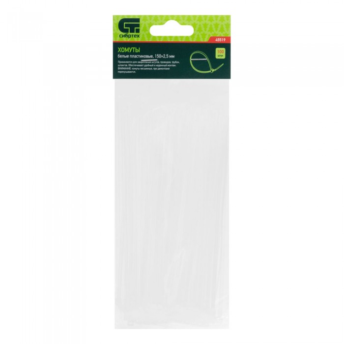 Хомуты, 150 x 2.5 мм, пластиковые, белые, 100 шт Сибртех (45519)