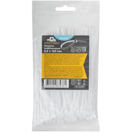 Хомуты нейлоновые для проводов, белые 100 шт., 2,5х120 мм (60243М)
