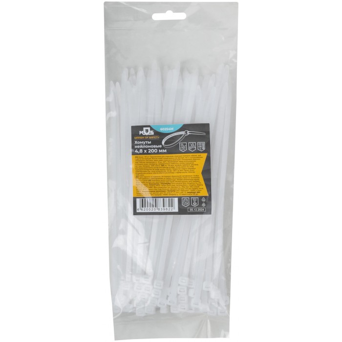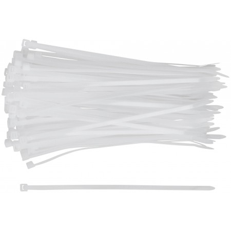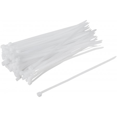 Белые. 100 шт. Предназначены для соединения и фиксации проводов, кабелей, труб и других конструкций. Монтаж может осуществляться как вручную, так и с использованием специального пистолета. Замок имеет ступенчатую фиксацию с блокировкой обратного хода. Материал: нейлон. Упаковка: п/э пакет с подвесом.