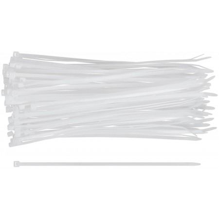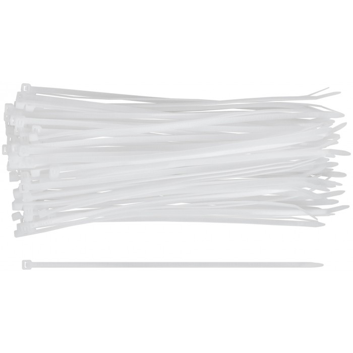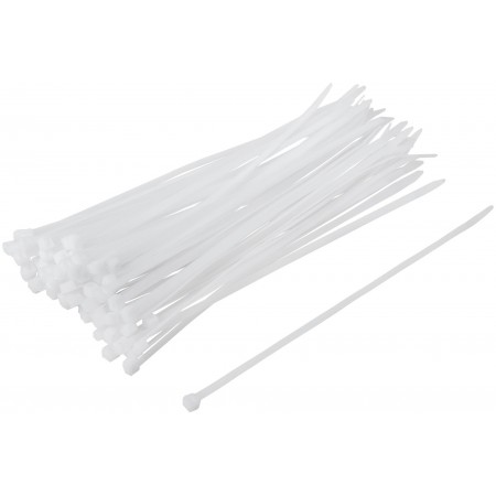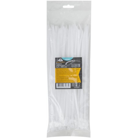 Белые. 100 шт. Предназначены для соединения и фиксации проводов, кабелей, труб и других конструкций. Монтаж может осуществляться как вручную, так и с использованием специального пистолета. Замок имеет ступенчатую фиксацию с блокировкой обратного хода. Материал: нейлон. Упаковка: п/э пакет с подвесом.