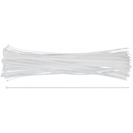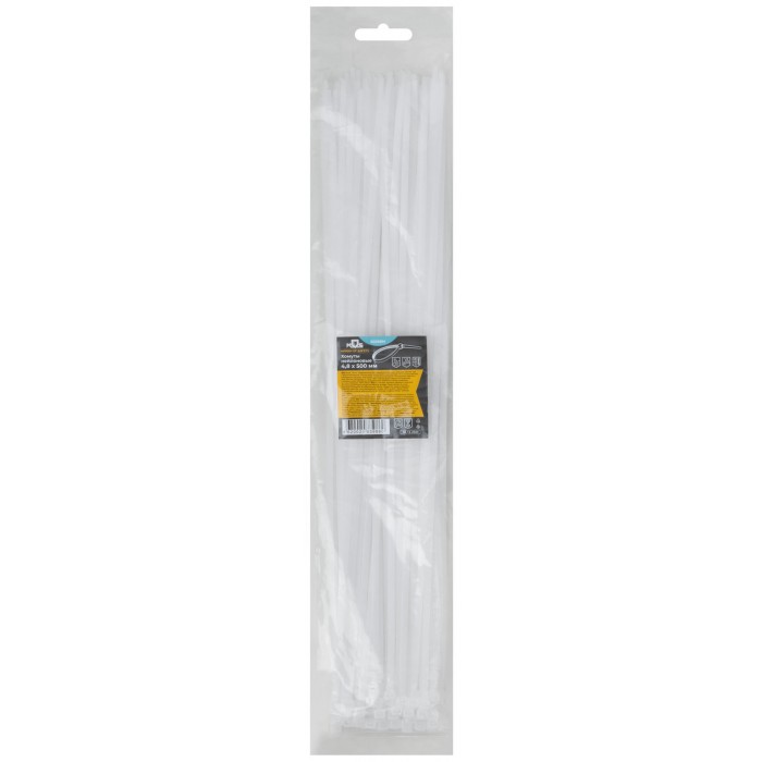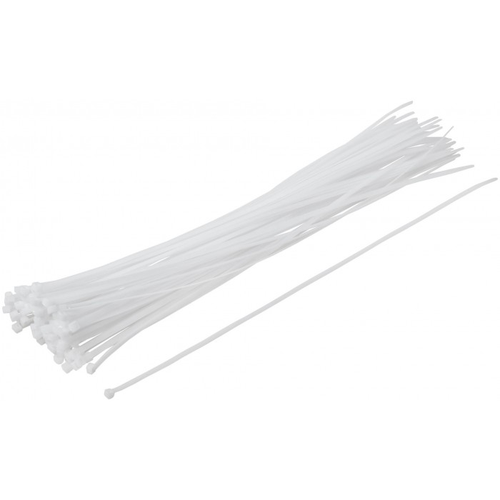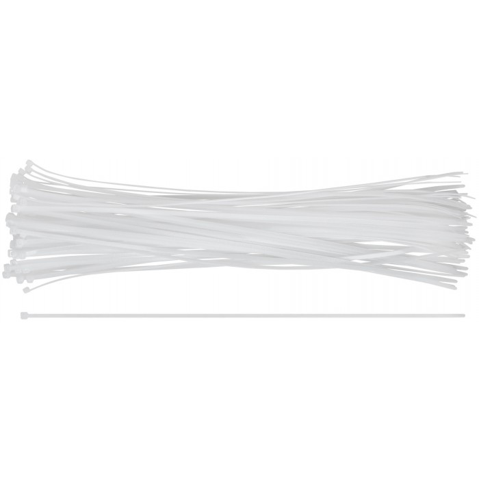 Белые. 100 шт. Предназначены для соединения и фиксации проводов, кабелей, труб и других конструкций. Монтаж может осуществляться как вручную, так и с использованием специального пистолета. Замок имеет ступенчатую фиксацию с блокировкой обратного хода. Материал: нейлон. Упаковка: п/э пакет с подвесом.