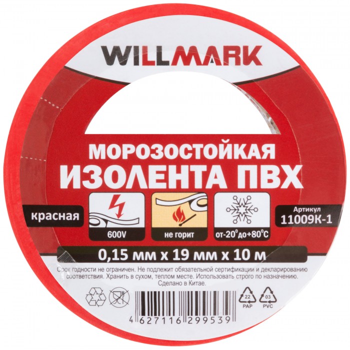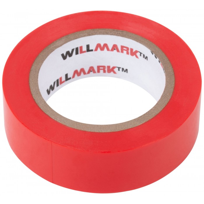 Изолента ПВХ самозатухающая WILLMARK 19 мм х 0,15 мм х 10 м ( красная ) (11014)