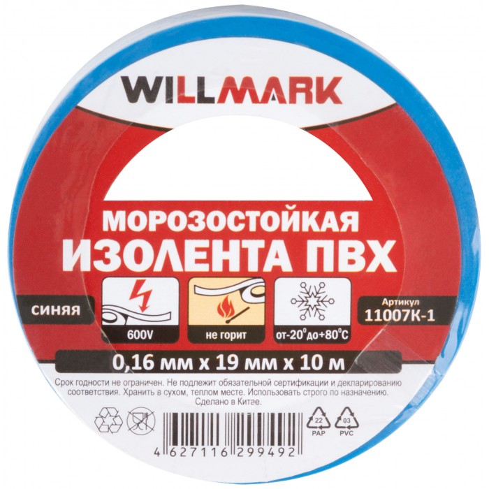 Изолента ПВХ самозатухающая WILLMARK 19 мм х 0,16 мм х 10 м ( синяя ) (11011)