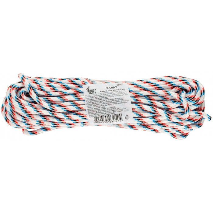 Канат полипропиленовый 24-х прядный с сердечником 6 мм х 20 м, р/н= 300 кгс (68401)