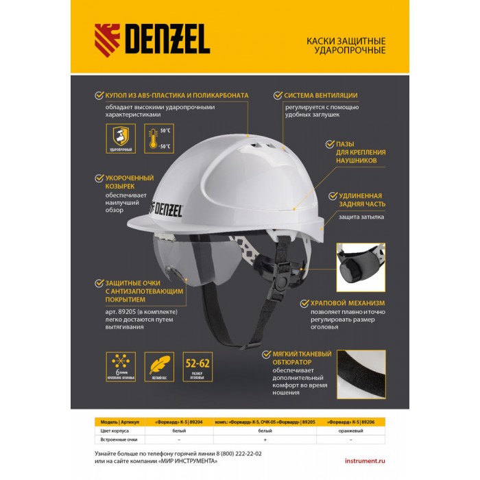 Каска защитная ударопрочная, ABS/PC, плавная регулировка, модель «Форвард» (К-05)белая Denzel (89204)