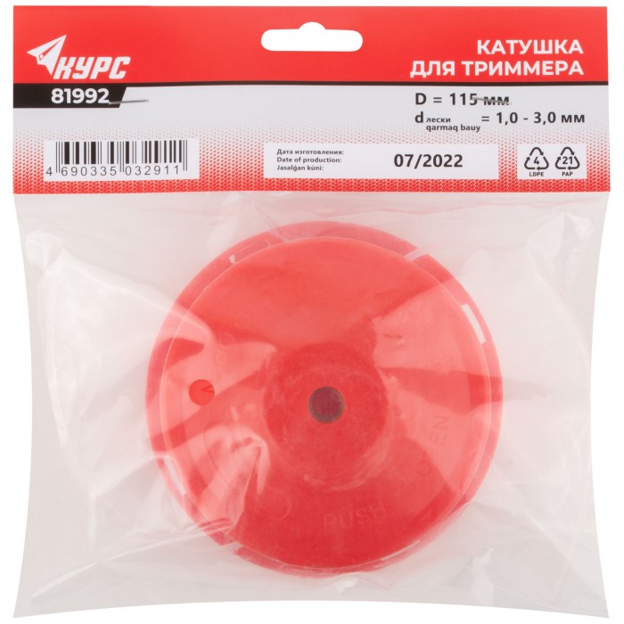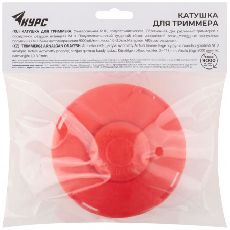 Для различных триммеров с посадочной резьбой шпинделя М10. Облегченная. Полуавтоматический (ударный) сброс изношенной лески. Усиленные пропускные проушины. D=115 мм; Частота враще-ния: 9000 об / мин; леска 1,0-3,0 мм. Материал: ABS пластик, металл. Упаковка: п/э пакет с картонным подвесом.
