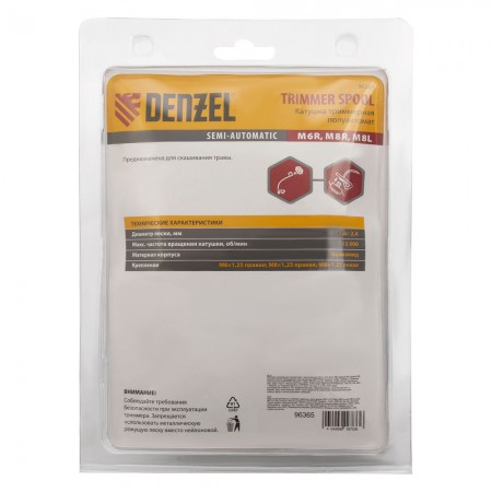 Катушка триммерная полуавтомат, шестигранник HEX х 15/6, болт М6 правый, М8 правый, М8 левый Denzel (96365)