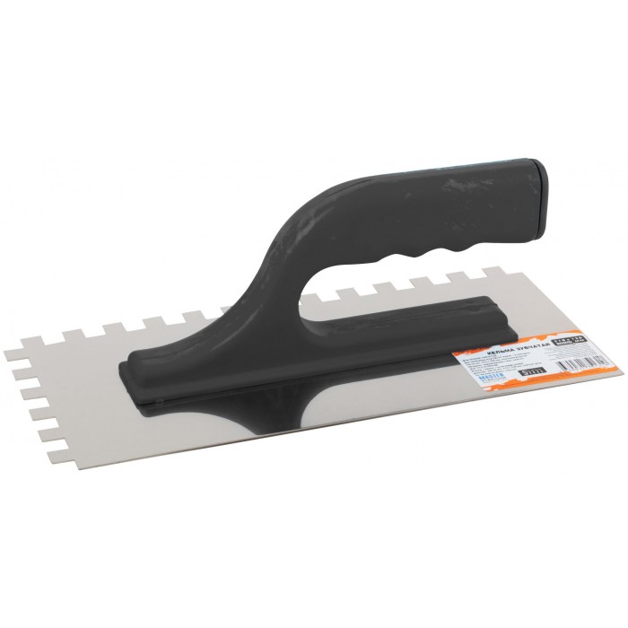 Кельма зубчатая. Для нанесения клея. Материал: немецкая нержавеющая сталь, пластиковая ручка. Размер 270х130 мм.