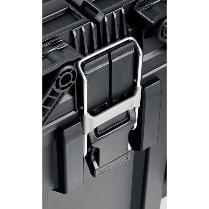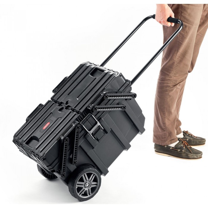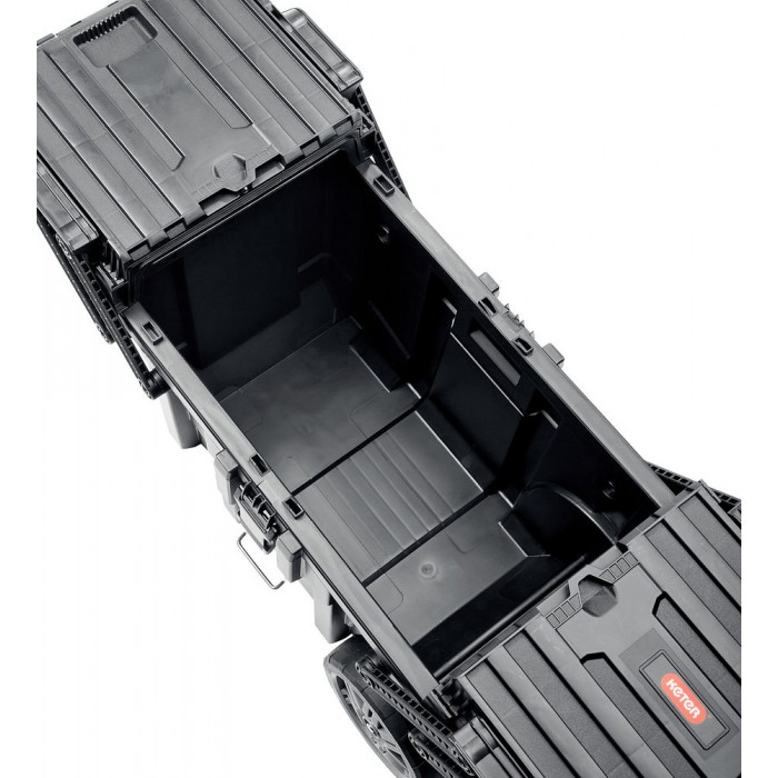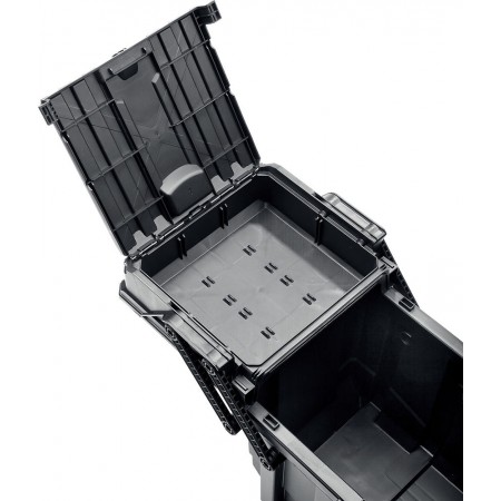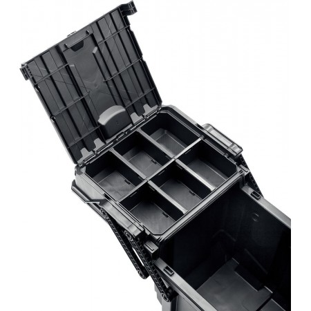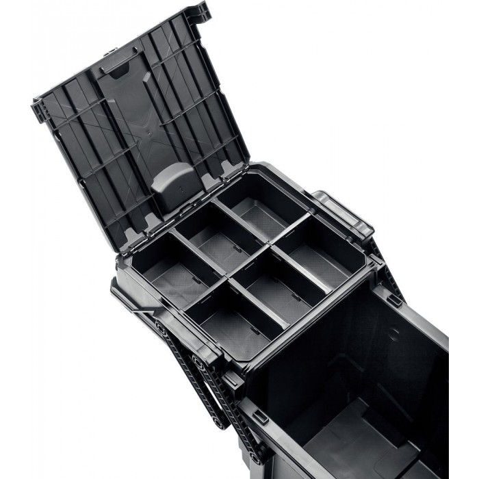 Модель имеет три отсека - два верхних маленьких и один большой нижний. Один из верхних отсеков разделен на шесть ячеек для хранения мелких элементов. Колеса прорезинены и устойчивы на любой поверхности.