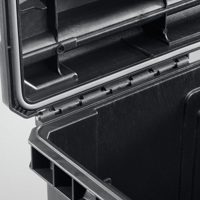 Надежная конструкция ящика с использованием металлических замков. Наличие уплотнителя для защиты инструмента от пыли и влаги