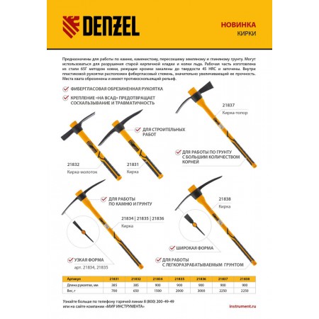 Кирка 700 г, фибергласовая обрезиненная рукоятка 385 мм Denzel (21831)