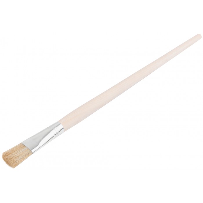 Плоская. Для работы со всеми видами лакокрасочных материалов. Натуральная светлая щетина, деревянная ручка.