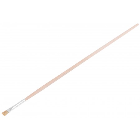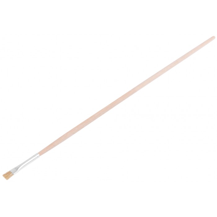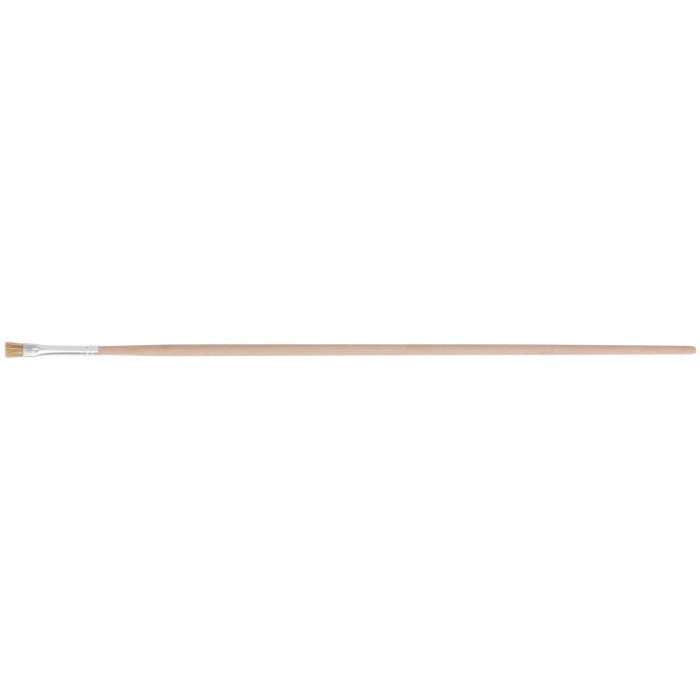 Плоская. Для работы со всеми видами лакокрасочных материалов. Натуральная светлая щетина, деревянная ручка.