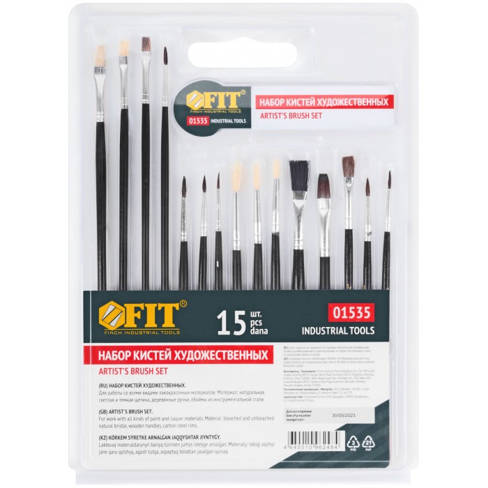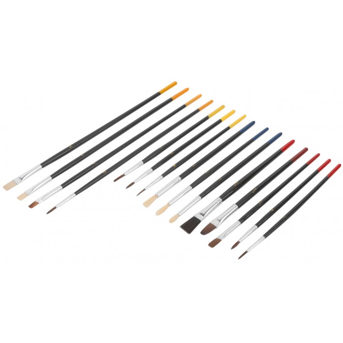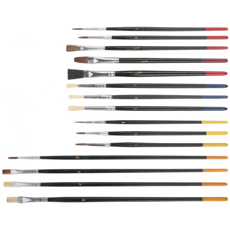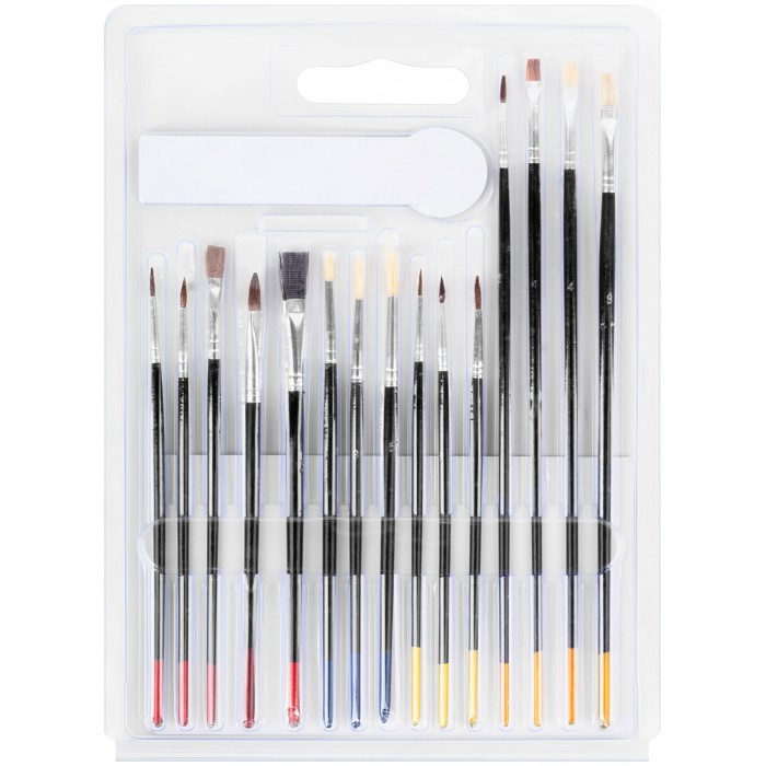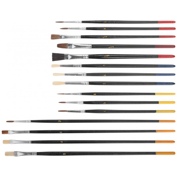 Набор 15 штук. Плоские и круглые. Для работы со всеми видами лакокрасочных материалов. Материал: натуральная светлая щетина, деревянные ручки. Упаковка: двойной блистер.