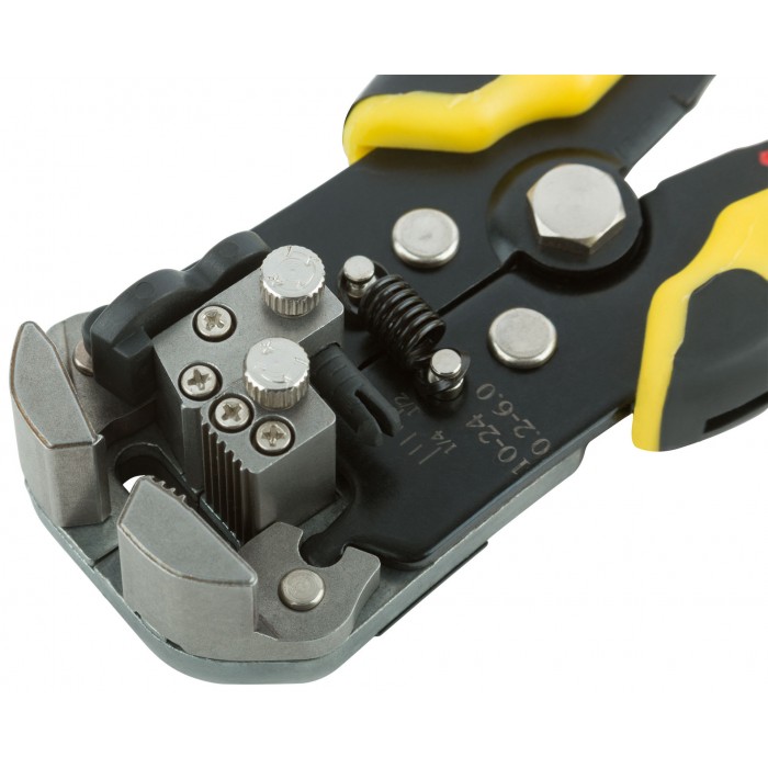 Регулируемый диаметр. Предназначены для снятия изоляции с проводов с сечением 0,2 - 6,0 мм2, их обрезки и обжимки изолированных и неизолированных клемм сечением 0,5 - 6,0 мм². Материал: губки из легированной стали, корпус из инструментальной стали с черненым покрытием, прорезиненные ручки из ударопрочного ABS пластика. Упаковка: блистер.