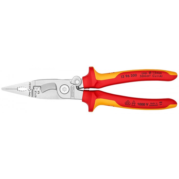 Клещи электромонтажные VDE 6-в-1 зачистка 0.75 – 1.5 / 2.5 мм? рез O 15 мм / 50 мм? 200 мм защёлка хром 2-комп диэлектрические ручки KN-1396200