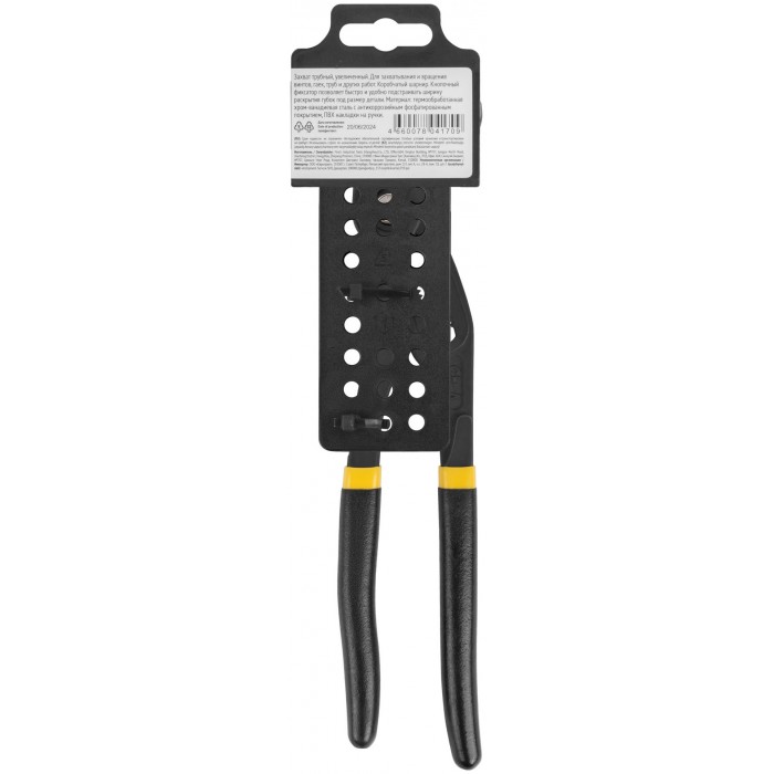 Профи. Захват трубный, увеличенный. Для захватывания и вращения винтов, гаек, труб и других работ. Кнопочный фиксатор позволяет быстро и удобно подстраивать ширину раскрытия губок под размер детали. Материал: термообработанная хром-ванадиевая сталь с антикоррозийным фосфатированным покрытием, ПВХ накладки на ручки.