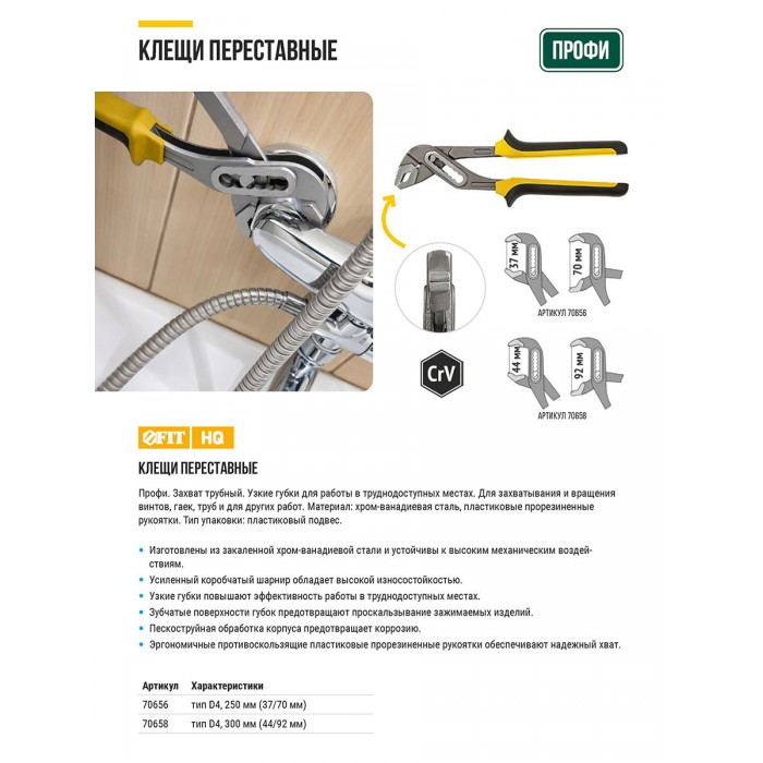 Клещи переставные CrV, тип D4, узкие губки 250 мм ( 37 / 70 мм ) (70656)