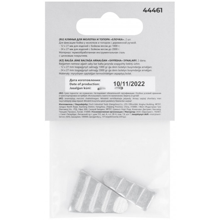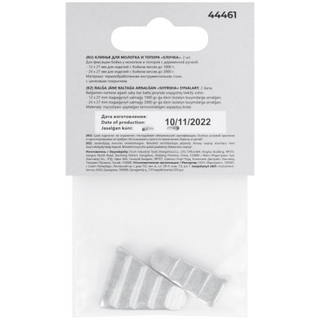 2 шт. Для фиксации молотков и топоров с деревянными рукоятками. Материал: инструментальная сталь, цинковое покрытие. Упаковка: П/Э пакет с картонным подвесом.