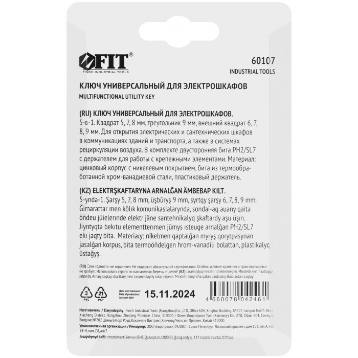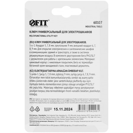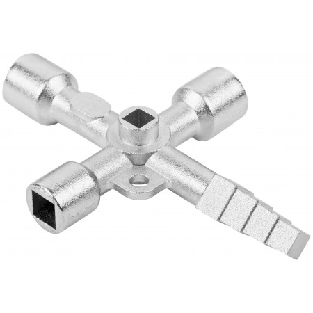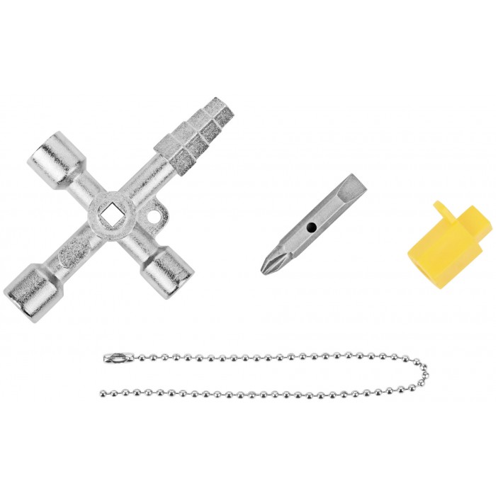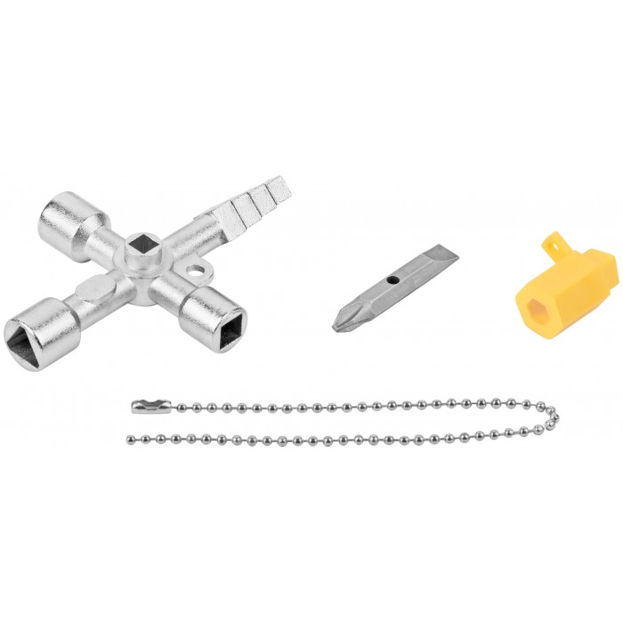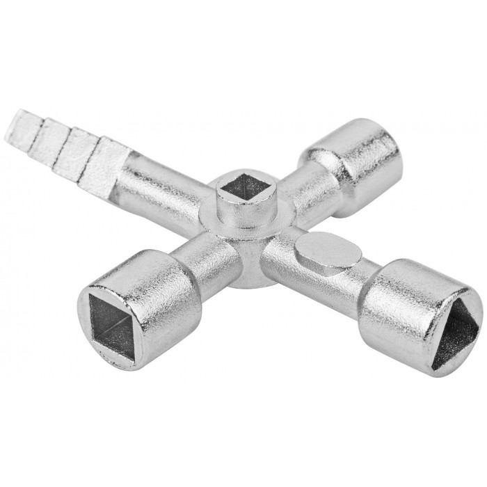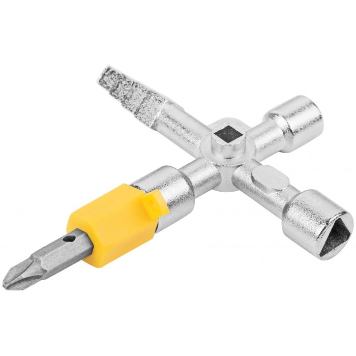 5-в-1. Для открытия электрических и сантехнических шкафов, в коммуникациях зданий и транспорта, а также в системах рециркуляции воздуха. Квадрат 5, 7, 8 мм, треугольник 9 мм, внешний квадрат 6, 7, 8, 9 мм. В комплекте двусторонняя бита PH2/SL7 с держателем. Материал: цинковый корпус с никелевым покрытием, бита из хром-ванадиевой стали, пластиковый держатель. Упаковка: блистер.