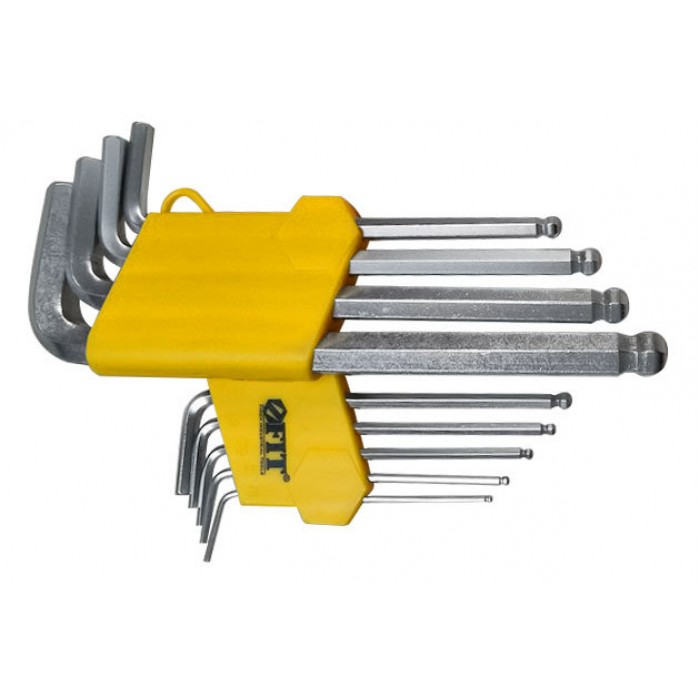Длинные. С шаровым наконечником, позволяющим работать в труднодоступных местах под углом до 35°. Набор 9 шт., в складном пластиковом держателе. Материал: хром-ванадиевая сталь, матовое хромированное покрытие. Упаковка: блистер.