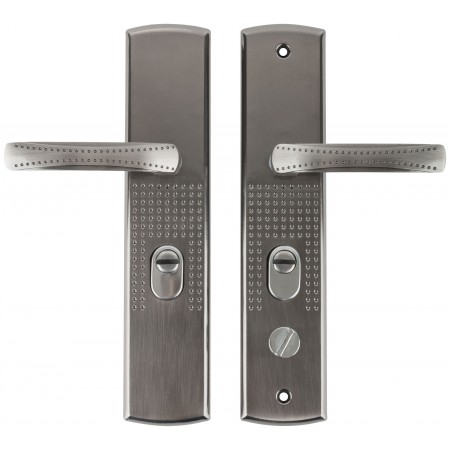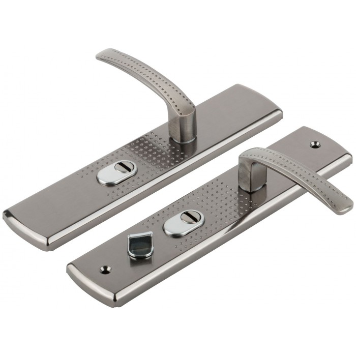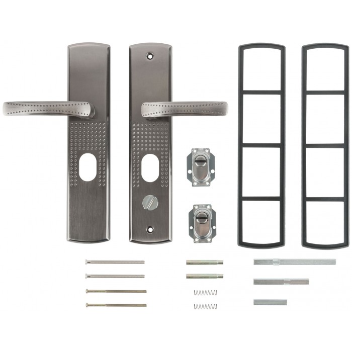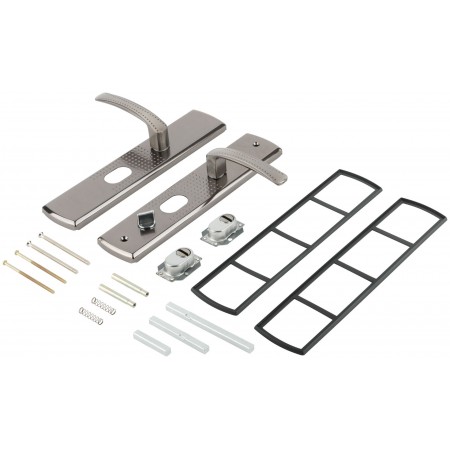 Цвет ручек и планка- никель/хром. В комплект входят две ручки , винтовые стяжки, пластиковые прокладки и квадратный штырь (8х8 мм) 110мм, комплекты стержней для автоматических и не автоматических замков . Подходит как для левых, так и для правых дверей. Материал: сталь 1,0 мм, гальваническое покрытие. Упаковка: картонная коробка.