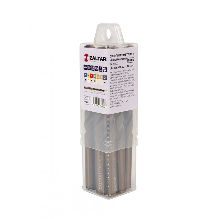Комплект свёрл по металлу индустриальных, 10 шт, DIN 338, HSS-E Co5, Тип VA, 5xD, O10.00 мм (ZA-74100-S10)