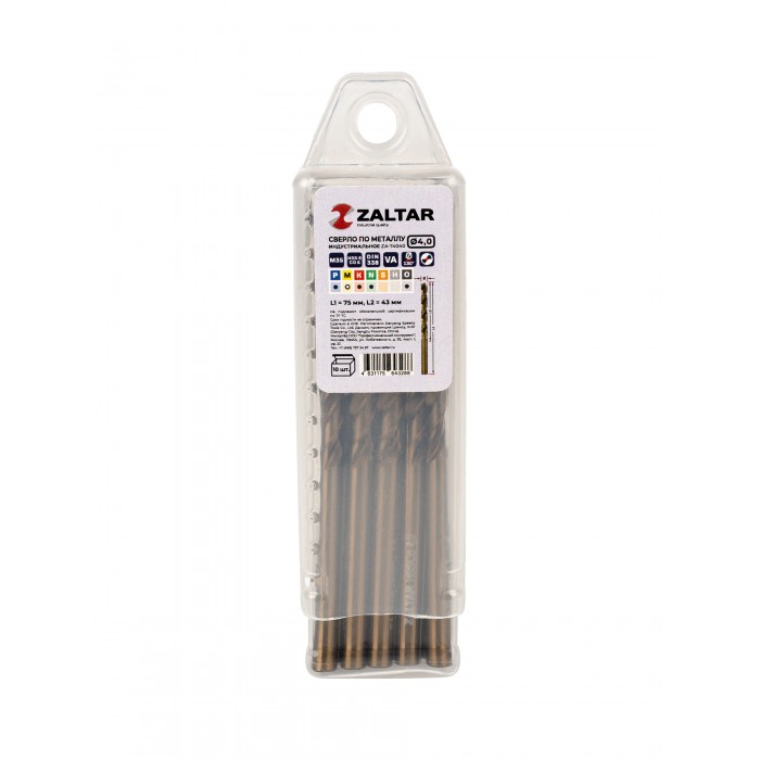 Комплект свёрл по металлу индустриальных, 10 шт, DIN 338, HSS-E Co5, Тип VA, 5xD, O4.00 мм (ZA-74040-S10)