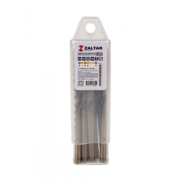 Комплект свёрл по металлу индустриальных, 10 шт, DIN 338, HSS-E Co5, Тип VA, 5xD, O4.50 мм (ZA-74045-S10)