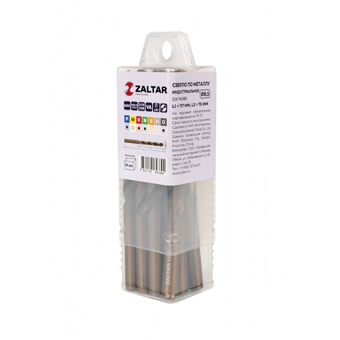 Комплект свёрл по металлу индустриальных, 10 шт, DIN 338, HSS-E Co5, Тип VA, 5xD, O8.50 мм (ZA-74085-S10)