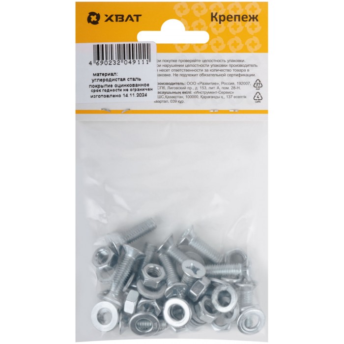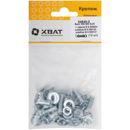 Комплект: Винт DIN965 6х20, с гайкой М6 DIN934, шайбой М 6 DIN125, шайбой М 6 DIN127 (фасовка 12шт.) (24840-3)