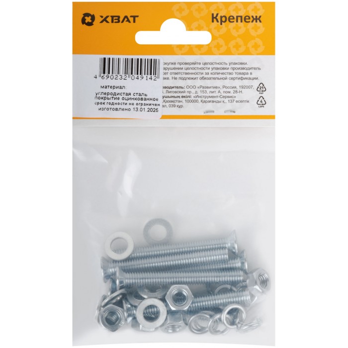 Комплект: Винт DIN965 6х50, с гайкой М6 DIN934, шайбой М 6 DIN125, шайбой М 6 DIN127 (фасовка 7шт.) (24843-3)