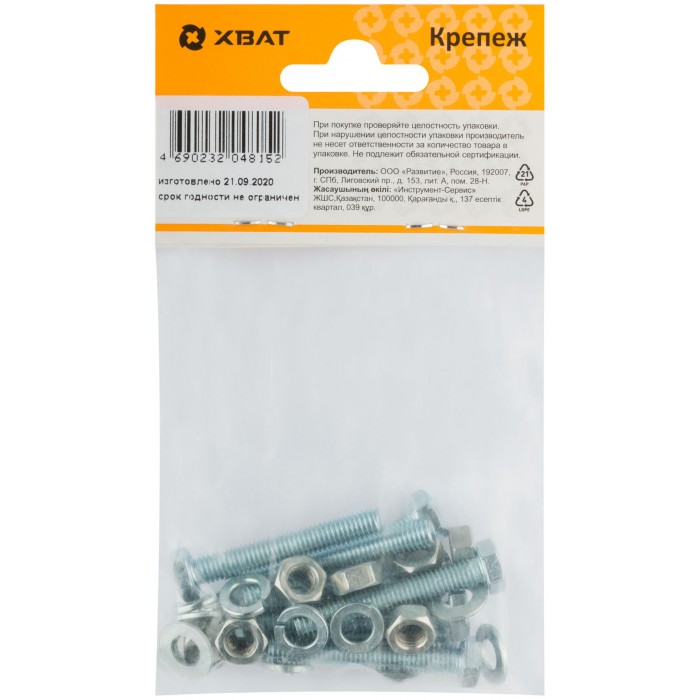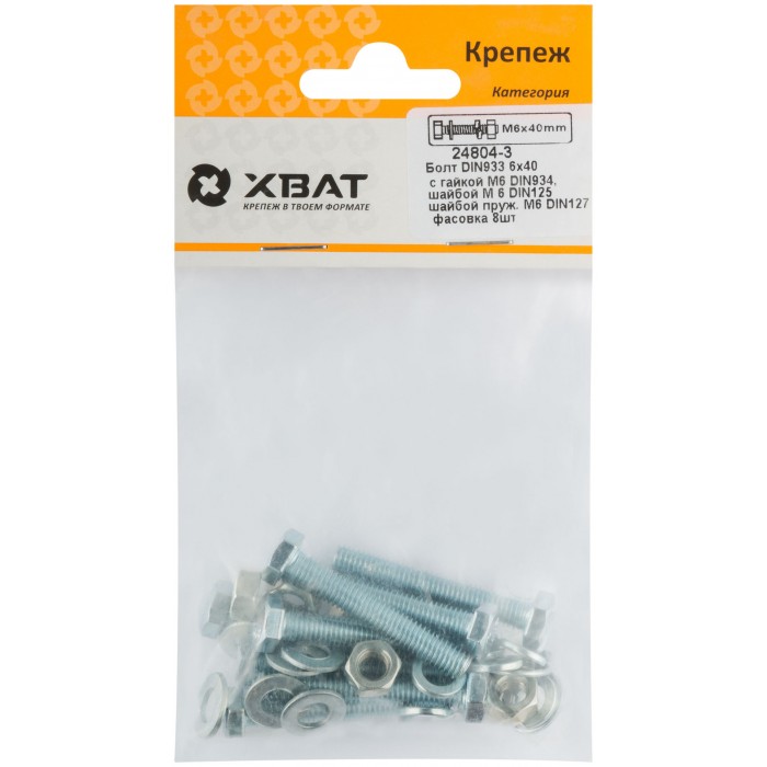 Комплект:Болт DIN933 6х40, с гайкой М6 DIN934, шайбой М 6 DIN125, шайбой пруж. М6 DIN127 (фасовка 8шт.) (24804-3)