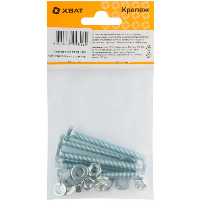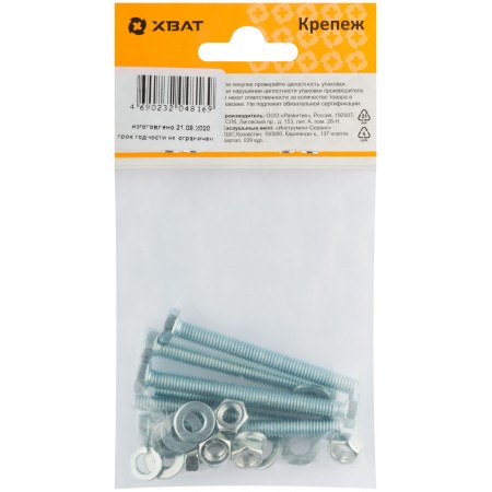 Комплект:Болт DIN933 6х60, с гайкой М6 DIN934, шайбой М 6 DIN125, шайбой пруж. М6 DIN127 (фасовка 6шт.) (24805-3)