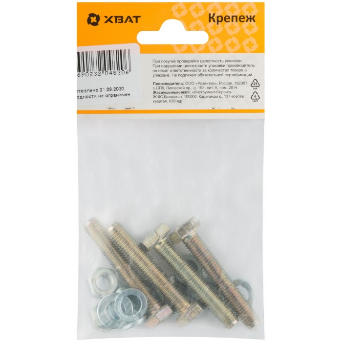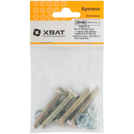 Комплект:Болт DIN933 8х50, с гайкой М8 DIN934, шайбой М 8 DIN125, шайбой пруж. М8 DIN127 (фасовка 4шт.) (24815-3)